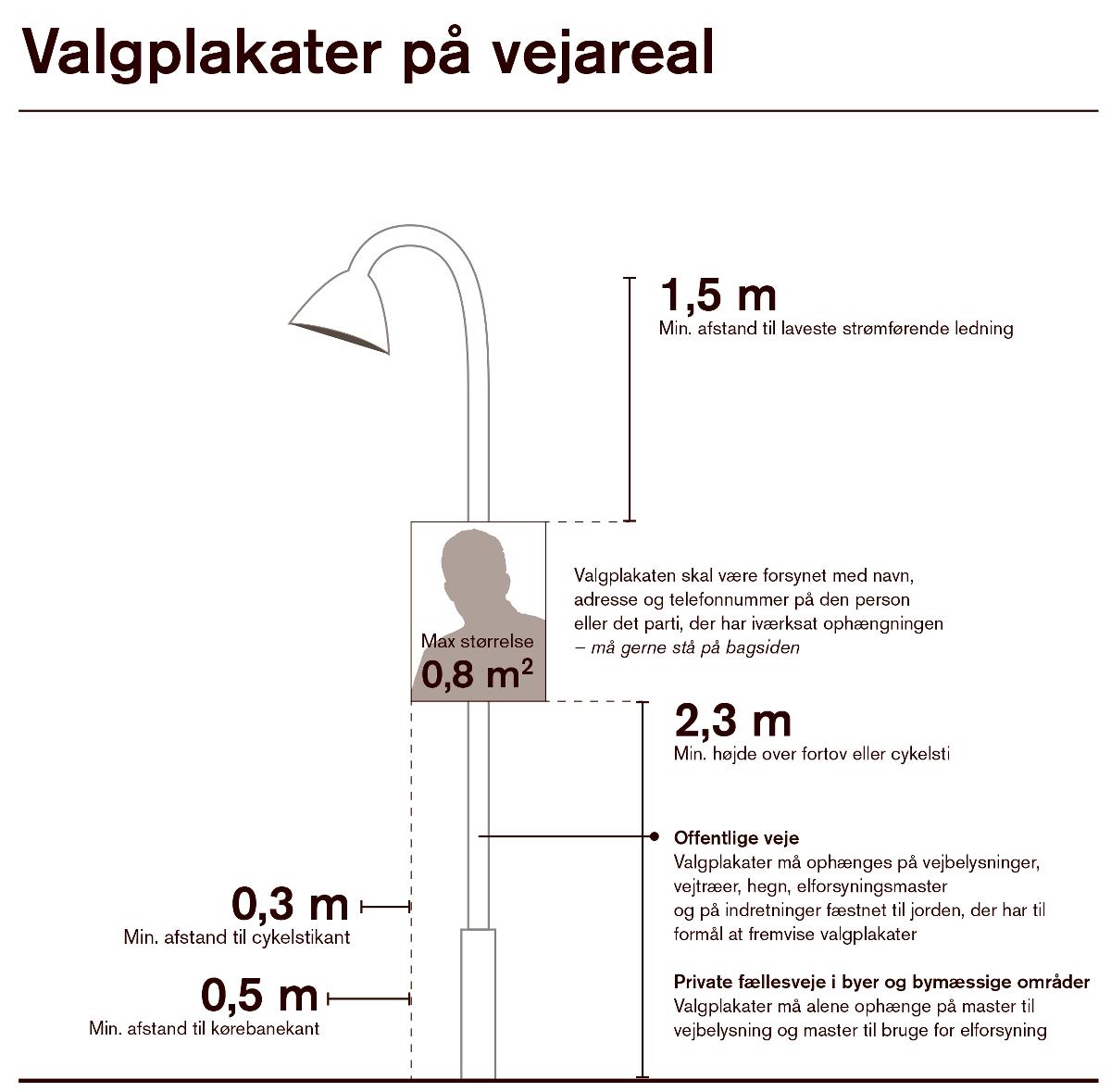 - nærmere end 0,5 meter fra kørebanekant eller 0,3 m fra cykelstikant målt fra nærmeste kant af valgplakaten,